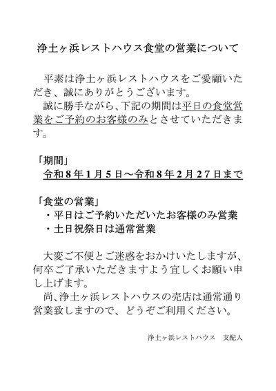お食事処「浜処うみねこ亭」営業日のお知らせ